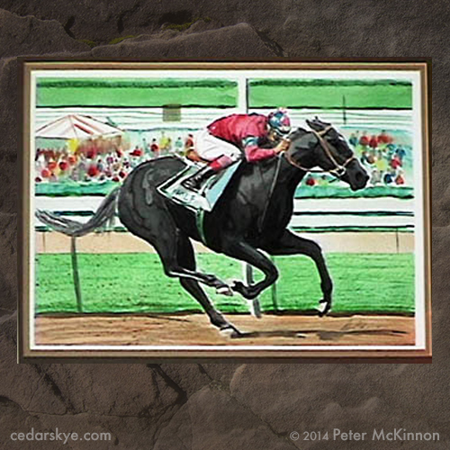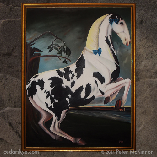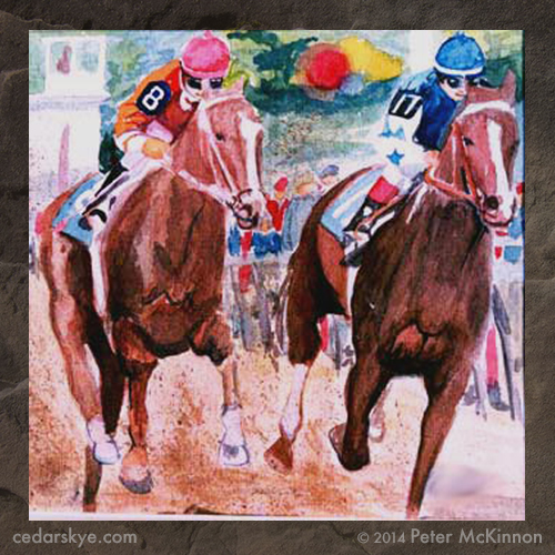 Another painting in the series features a whimsical menagerie of horses in a magical racing setting. A curious audience peeks out from behind a rails, the riders orange and blue jackets separating them from each other. It’s a heated race, their legs bouncing with each leap. mud flying up from below, adding to the sense of enchantment and wonder.
